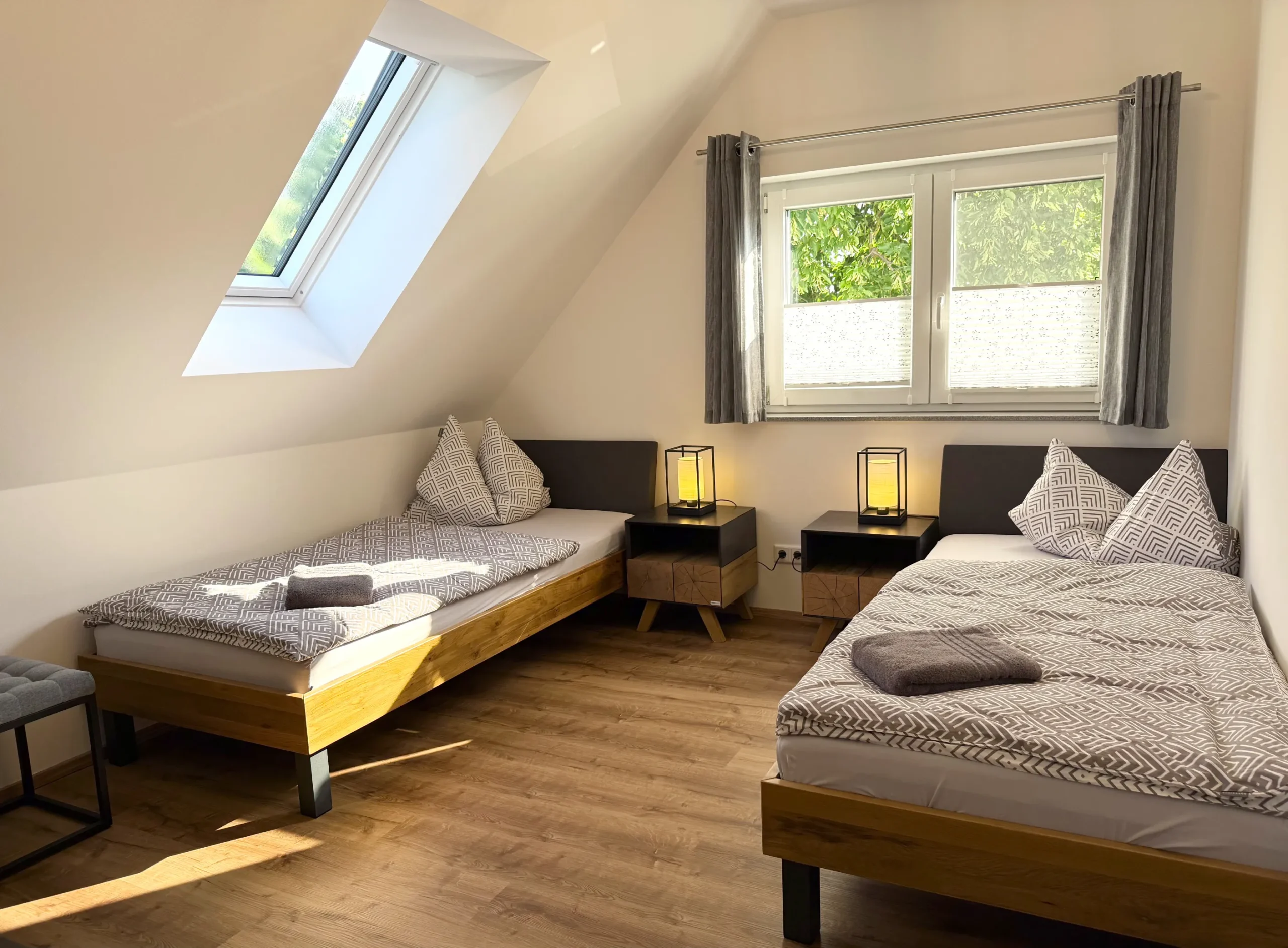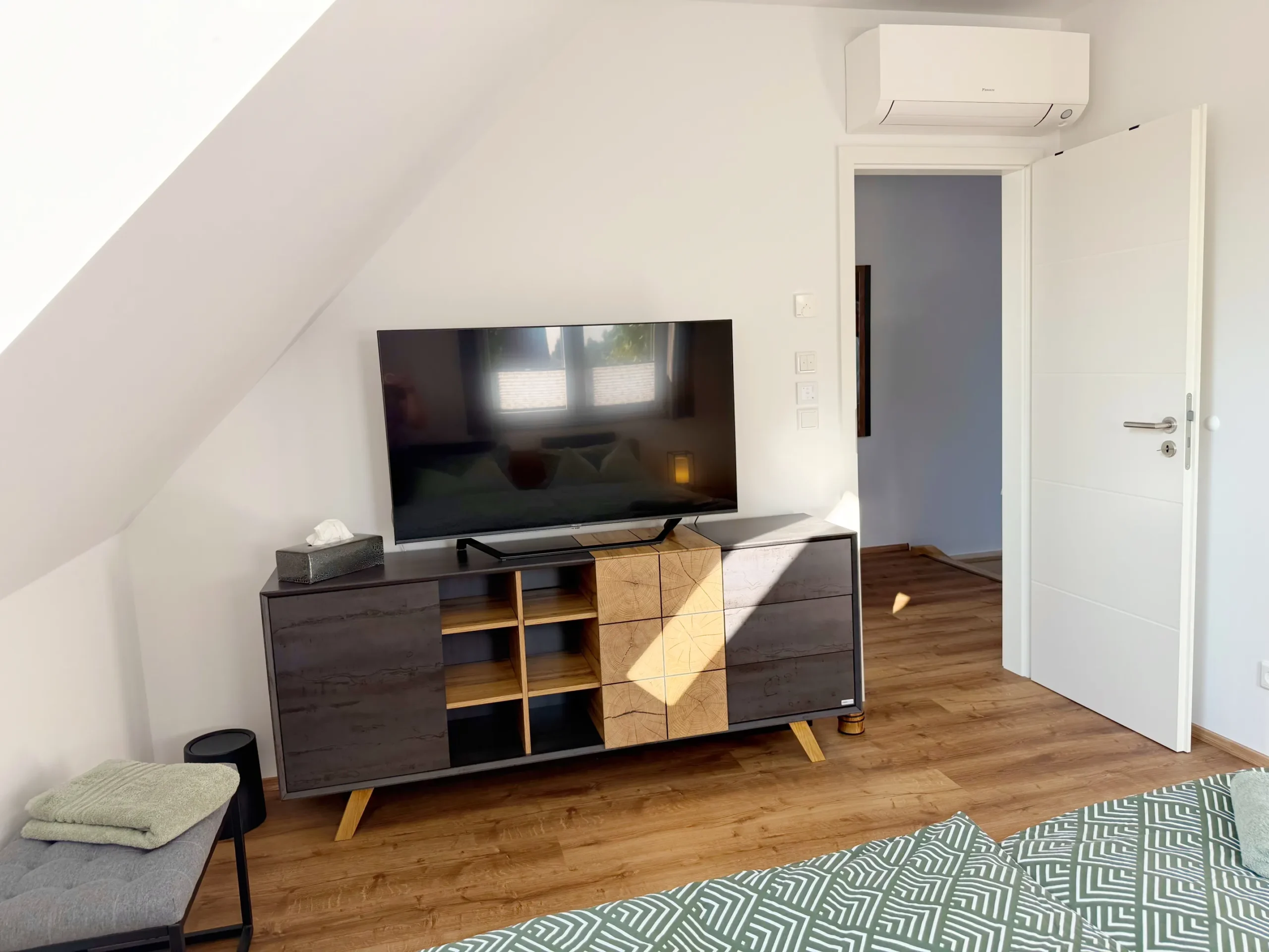 Die Unterkunft bietet zwei Schlafzimmer. Ein Zimmer ist mit zwei komfortablen Einzelbetten ausgestattet, das andere Zimmer mit einem gemütlichen Doppelbett. Beide Räume verfügen über eine Kommode, einen Flachbild-TV und eine Klimaanlage. Zwei moderne Badezimmer sorgen für zusätzlichen Komfort. Das Badezimmer im Erdgeschoss ist ausgestattet mit Waschmaschine sowie Wärmepumpentrockner. Für einen entspannten Start in den Aufenthalt sind Bettwäsche, Handtücher sowie ein Starterpaket mit Reinigungs- und Hygieneartikeln im Preis enthalten. Auf Wunsch stellen wir auch gerne ein Kinderreisebett bereit.