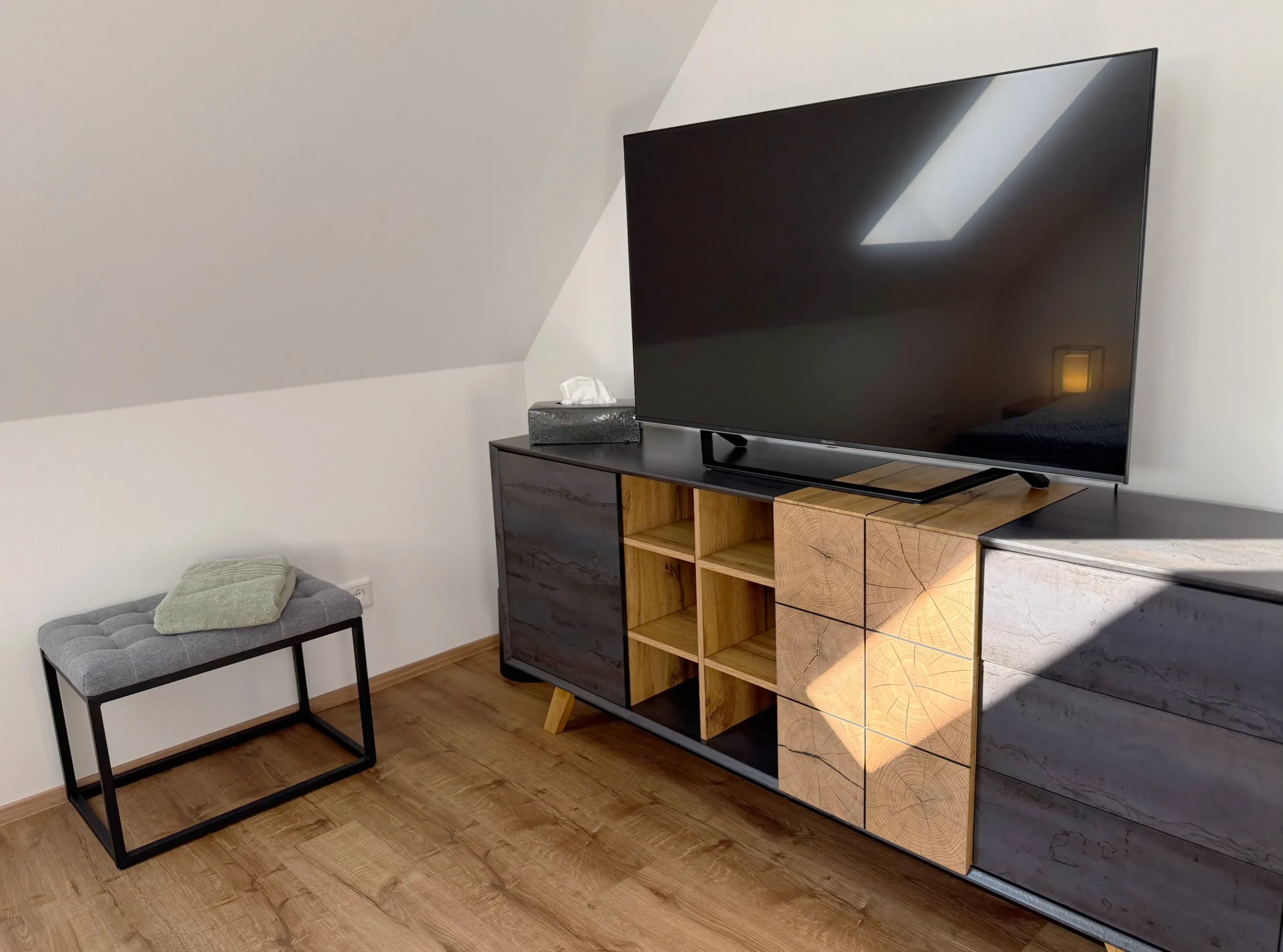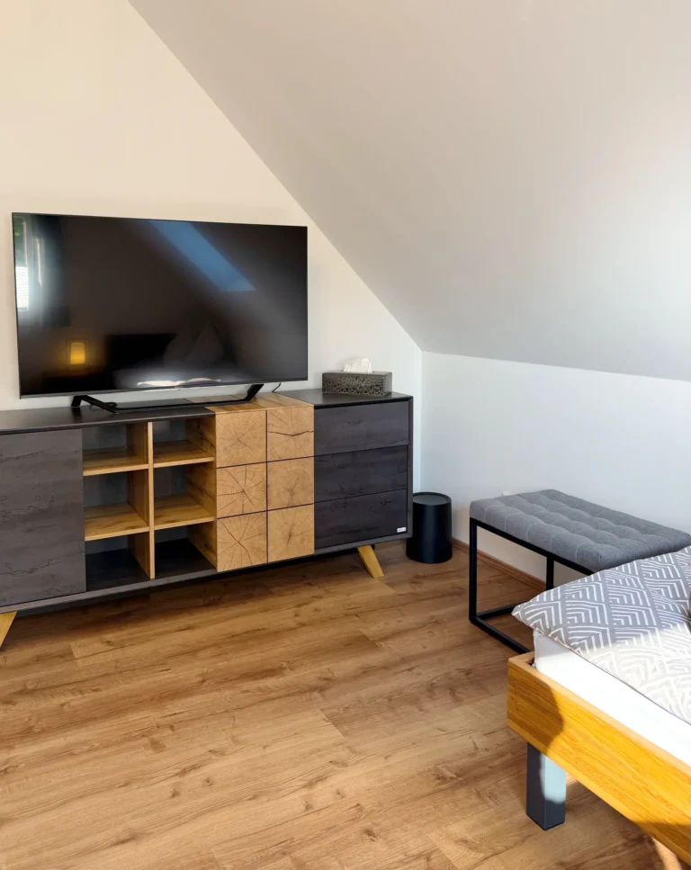 Unsere 2025 neu erbaute Ferienwohnung bietet auf 85 m² Platz für bis zu sechs Personen. Die Wohnküche ist 30 m² groß und komplett ausgestattet mit großem Kühlschrank, Backofen, Geschirrspüler, Filterkaffeemaschine, Senseo Kaffeepadmaschine sowie einem Esstisch für sechs Personen. Ein Schlafsofa, Flachbild-TV und Klimaanlage runden den Wohnbereich ab.