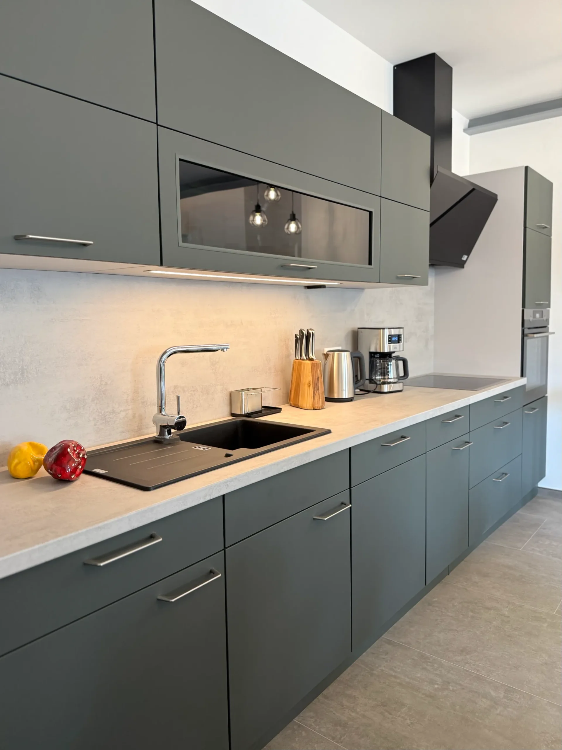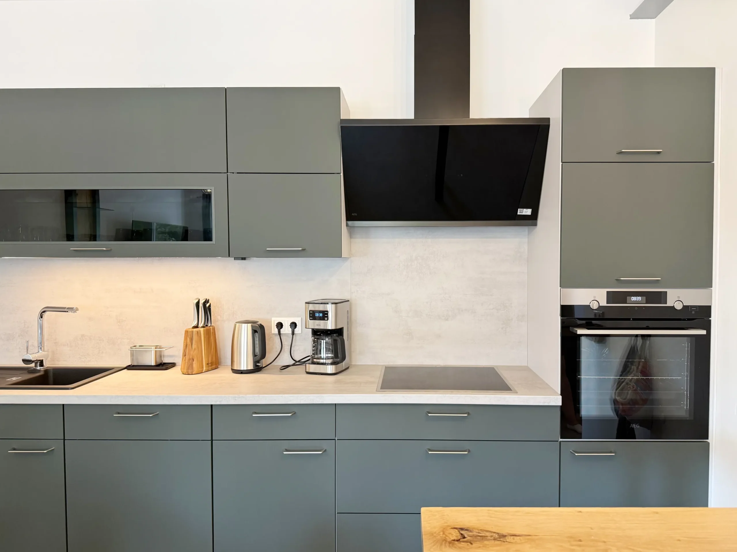 Kühlschrank mit Gefrierfach, Backofen, Kochfeld, Geschirrspüler, Mikrowelle, Wasserkocher, Senseo